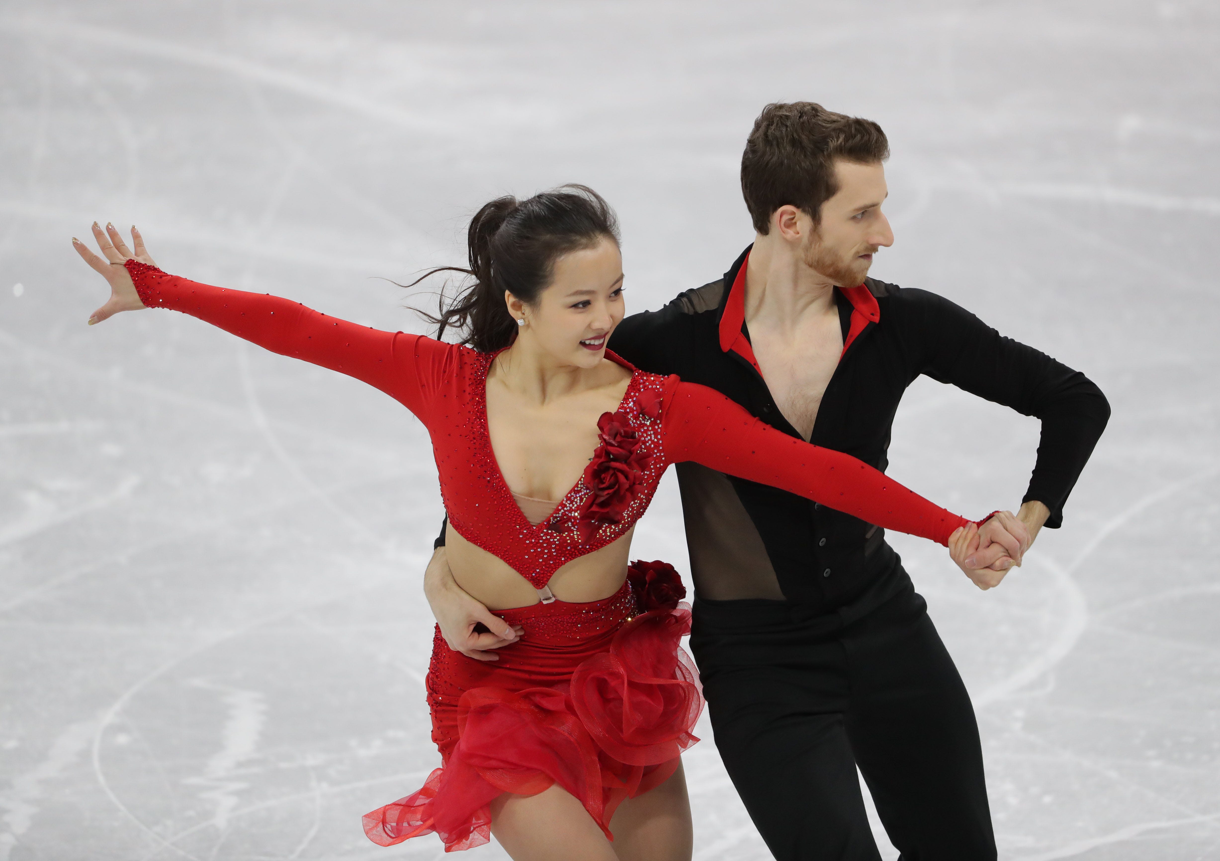 Yura Min, competing in team figure skating event, had to ad-lib parts of routine to try to keep her top up after hook in costume came undone.